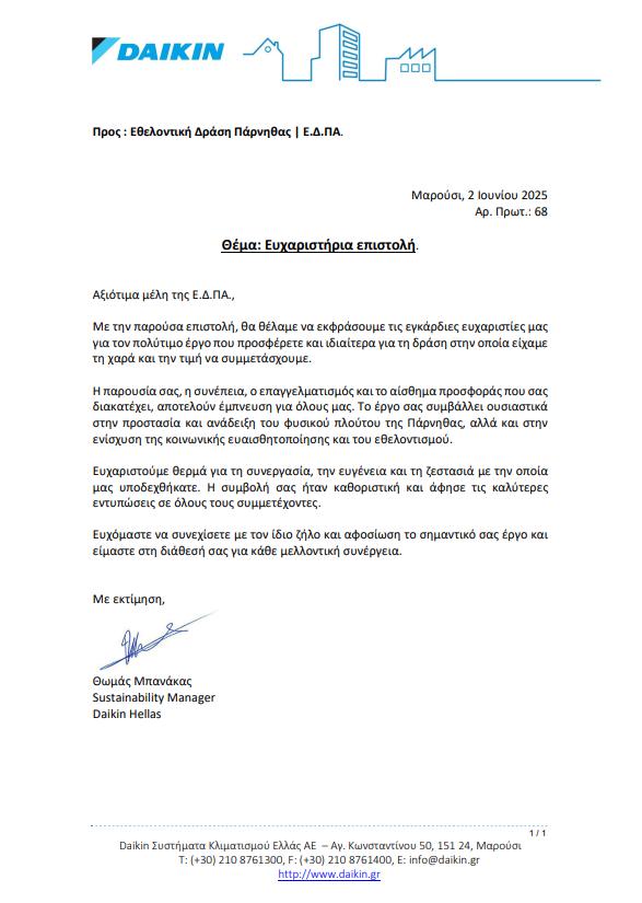 Η ομάδα της Daikin Hellas συμμετείχε σε μια ξεχωριστή πεζοπορία που οργανώσαμε με πολύ χαρά, εξερευνώντας τα μονοπάτια του δρυμού, μαθαίνοντας για τη χλωρίδα, την πανίδα αλλά και τις ιστορίες που κρύβουν τα δέντρα και τα μονοπάτια της περιοχής. Μιλήσαμε και για τα προβλήματα που αντιμετωπίζει το βουνό σήμερα και πόσο πολύτιμη είναι η παρουσία εθελοντών.