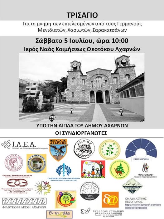 Το Σάββατο 5 Ιουλίου στις 10:00 το πρωί θα γίνει στον Ιερό Ναό Κοιμήσεως Θεοτόκου Αχαρνών τρισάγιο στην μνήμη των εκτελεσμένων από τους Γερμανούς Ελλήνων πατριωτών, Μενιδιατών, Χασιωτών και Σαρακατσάνων.
